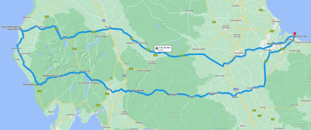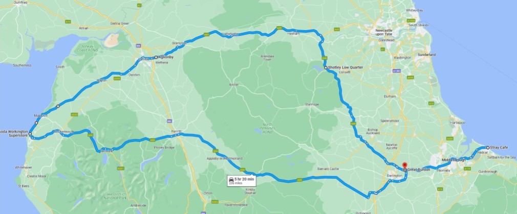 The A66 technically starts near the east coast on the eastern side of Middlesbrough, just at the Grangetown roundabout. I have decided to make our start point 5 miles east in Redcar, at the Stray Cafe (Coast Rd, Redcar TS10 3AX), which overlooks the North Sea.
