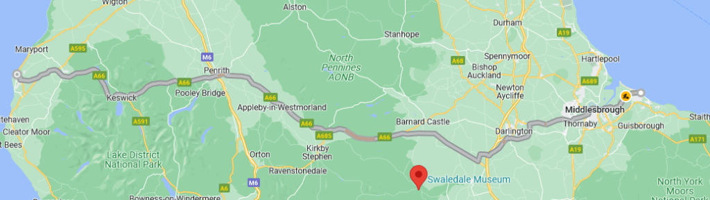 The end point of the A66 is at the junction with the A596 in Workington, but I have chosen to finish at the Asda store which is only a mile and a half further on, on the other side of the river Derwent, and almost overlooks the Irish Sea. There is a cafe, fuel, etc. https://storelocator.asda.com/north-west/workington/dunmail-park. I have set Google maps to avoid motorways, so the route can be used by any vehicle.